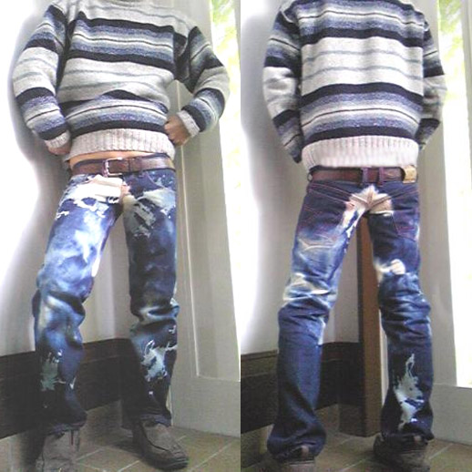 お客様からのコメント:股上前14cm、同後19cmのスーパーローライズです。家庭用のブリーチ剤を散らして加工してみました。オーダーメイドの利点は世界で自分ひとりだけの愛用品を入手できることにあると思っています。